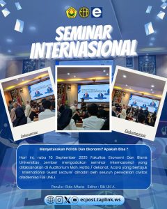 Rabu 10 September 2025 Fakultas Ekonomi Dan Bisnis Universitas Jember mengadakan seminar internasional yang dilaksanakan di Audutorium Moh. Hatta/dekanat. Acara yang bertajuk “International Guest Lecture” dihadiri oleh seluruh perwakilan civitas akademika FEB UNEJ, yang terdiri dari : Dekan, wakil dekan I, kaprodi, sekretaris jurusan serta perwakilan mahasiswa dari setiap program studi.Seminar kali ini, menghadirkan narasumber akademisi Indonesia yang menjadi dosen di Universiti Sultan Zainal Abidin, Malaysia. Dosen tersebut yakni Assoc. Prof. Dr. Suyatno Ladiqi, yang memberikan materi pentingnya SDGs. Derasnya arus globalisasi tentu mempengaruhi praktik ekonomi dan politik yang terjadi saat ini, sehingga kita harus cerdas dalam menyeleraskan definisi dua hal ini. “ Politik tidak serta merta bisa dipisahkan dari ekonomi, ibaratnya simbiosis yang saling melengakapi satu sama lain, sehingga tercapainya kesejahteran masyarakat yang berkelanjutan.” Ujar narasumber. Hal ini sangat relevan pada keadaan politik maupun ekonomi yang sedang terjadi di Indonesia, namun pada praktiknya kadang tidak selaras dengan yang diajarkan di kampus, sekolah, instansi public dll. Akibatnya potensi korupsi, kolusi dan nepotisme masih marak terjadi di tengah-tengah masyarakat kita. Perlu dipahami menyetarakan politik dan ekonomi sangat penting pada keberlangsungan hidup masyarakat, Hal ini tertuang dalam salah satu 17 tujuan SDGs yang dicanangkan oleh PBB untuk menciptakan perdamaian di seluruh dunia. Selain menyetarakan antara ekonomi dan politik narasumber berpesan pendidikan juga jadi salah satu motor penggerak perekonomian bangsa, oleh karena itu pendidikan perlu ditingkatkan untuk mendukung pertumbuhan ekonomi dan politik di masa depan. “ Harapan saya kedepannya semoga seluruh bangsa Indonesia sadar akan pentingya ekonomi, politik dan pendidikan untuk masa depan kita semua”. Ujar Dani salah satu peserta seminar Internasional.